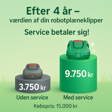 Et serviceeftersyn forebygger driftsstop og sikrer, at robotten klipper jævnt og stabilt hele sæsonen.